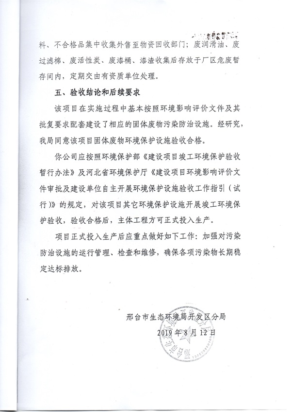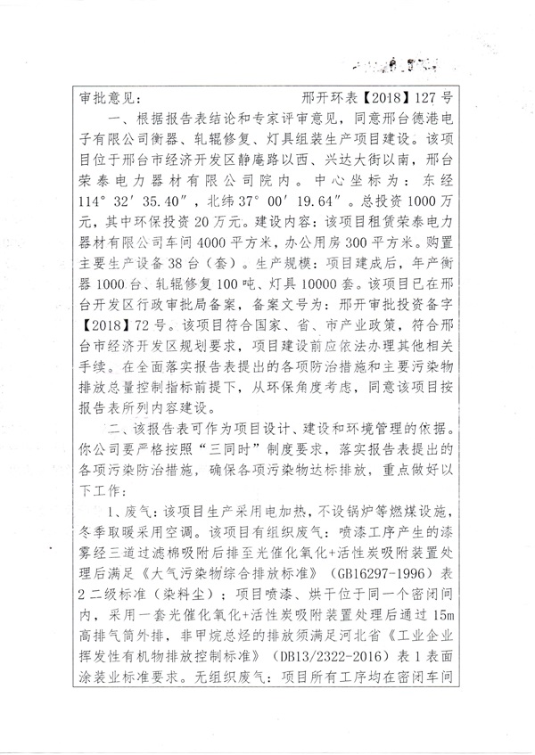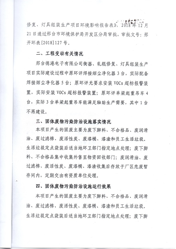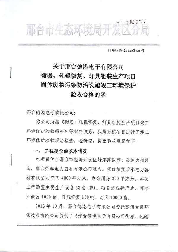 关于邢台德港电子有限公司竣工环境保护验收合格的函